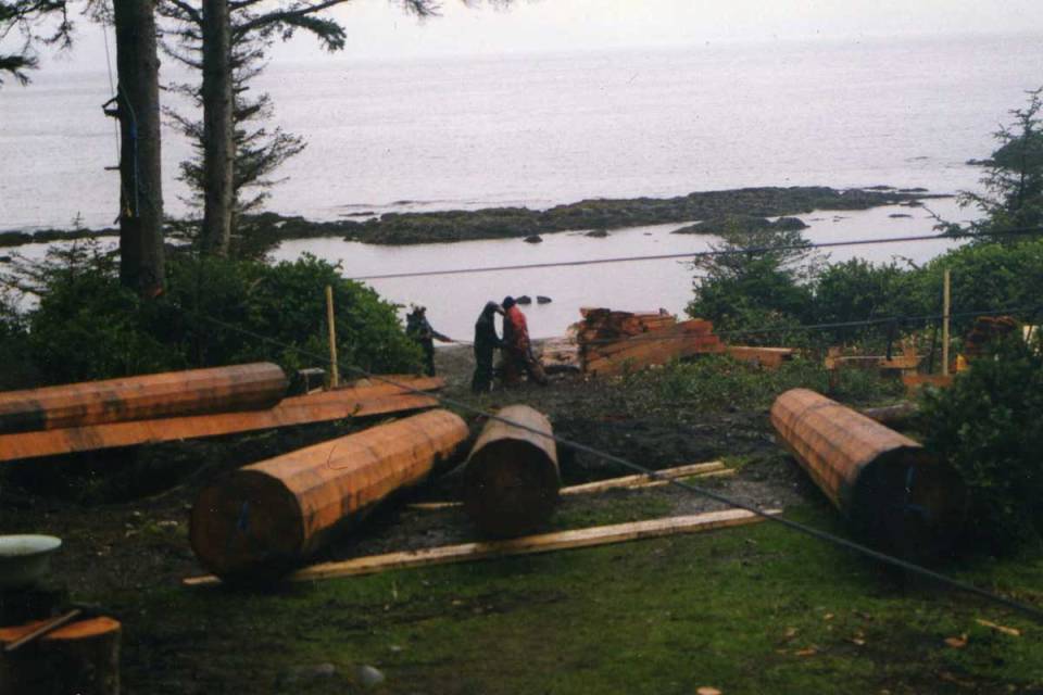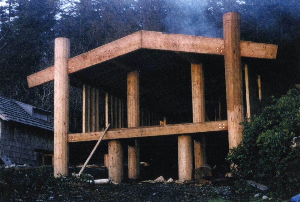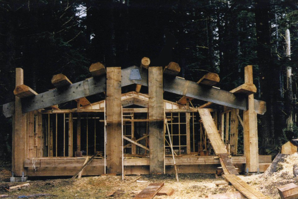6 beam longhouse, under construction, in Windy Bay on Lyell Island
